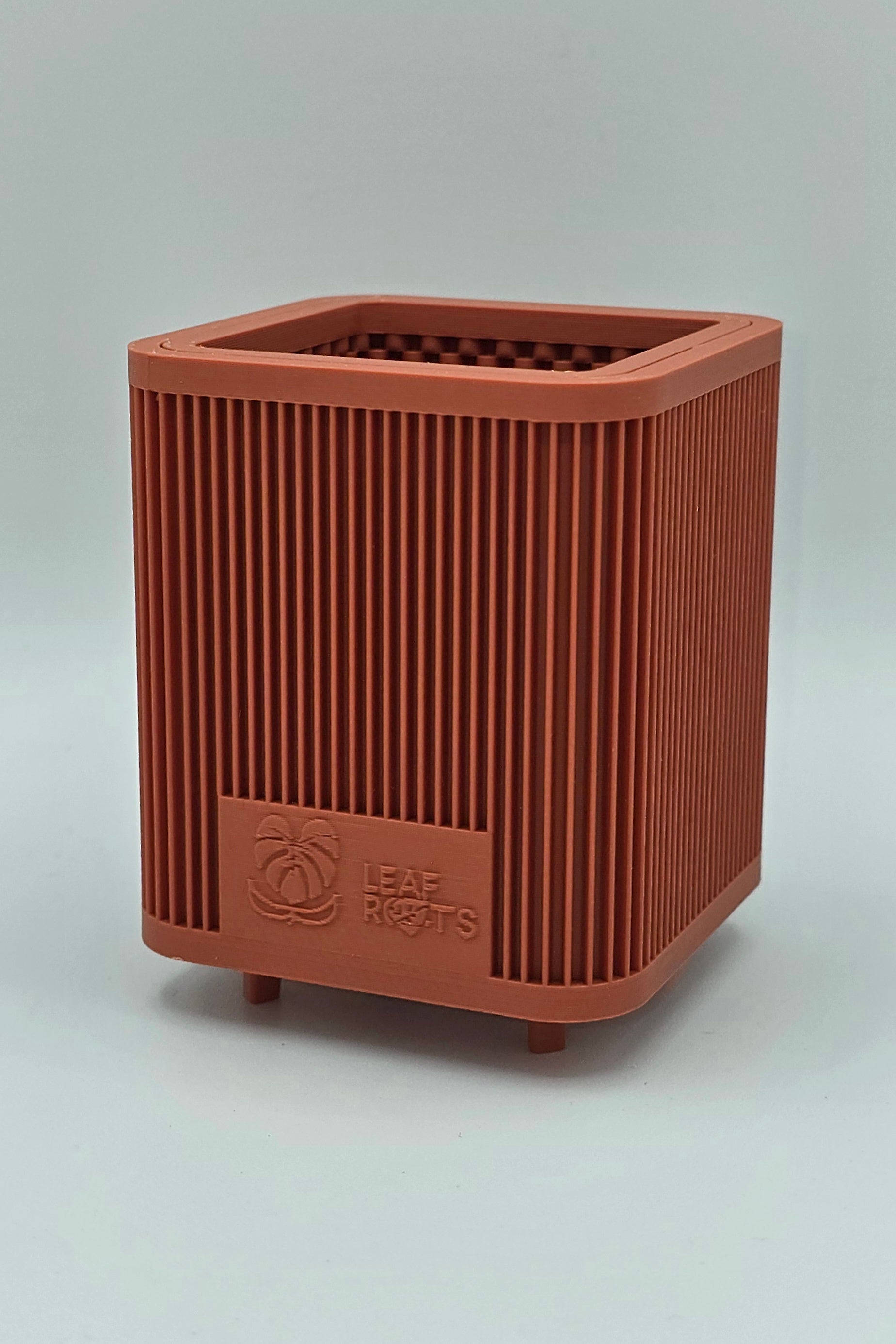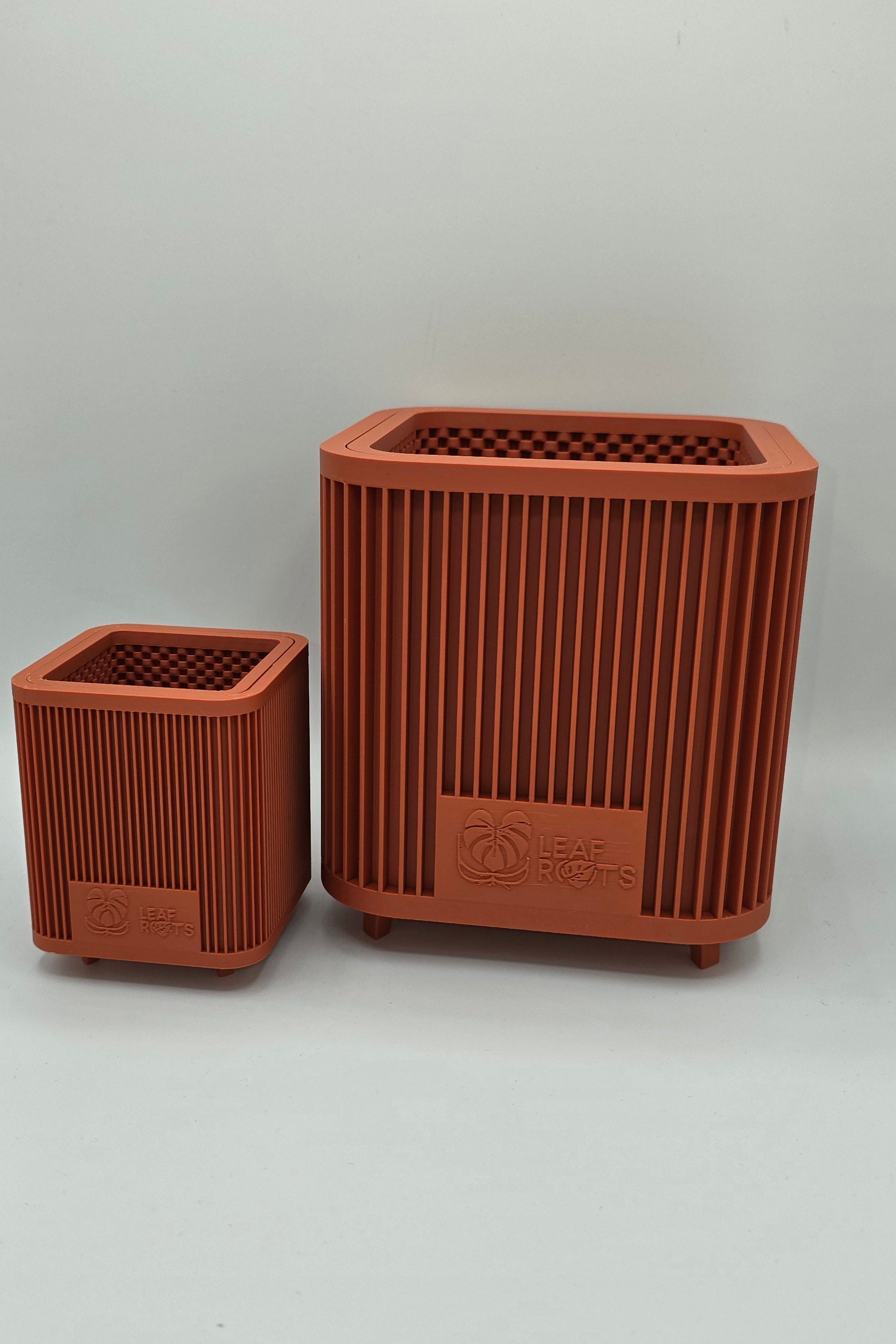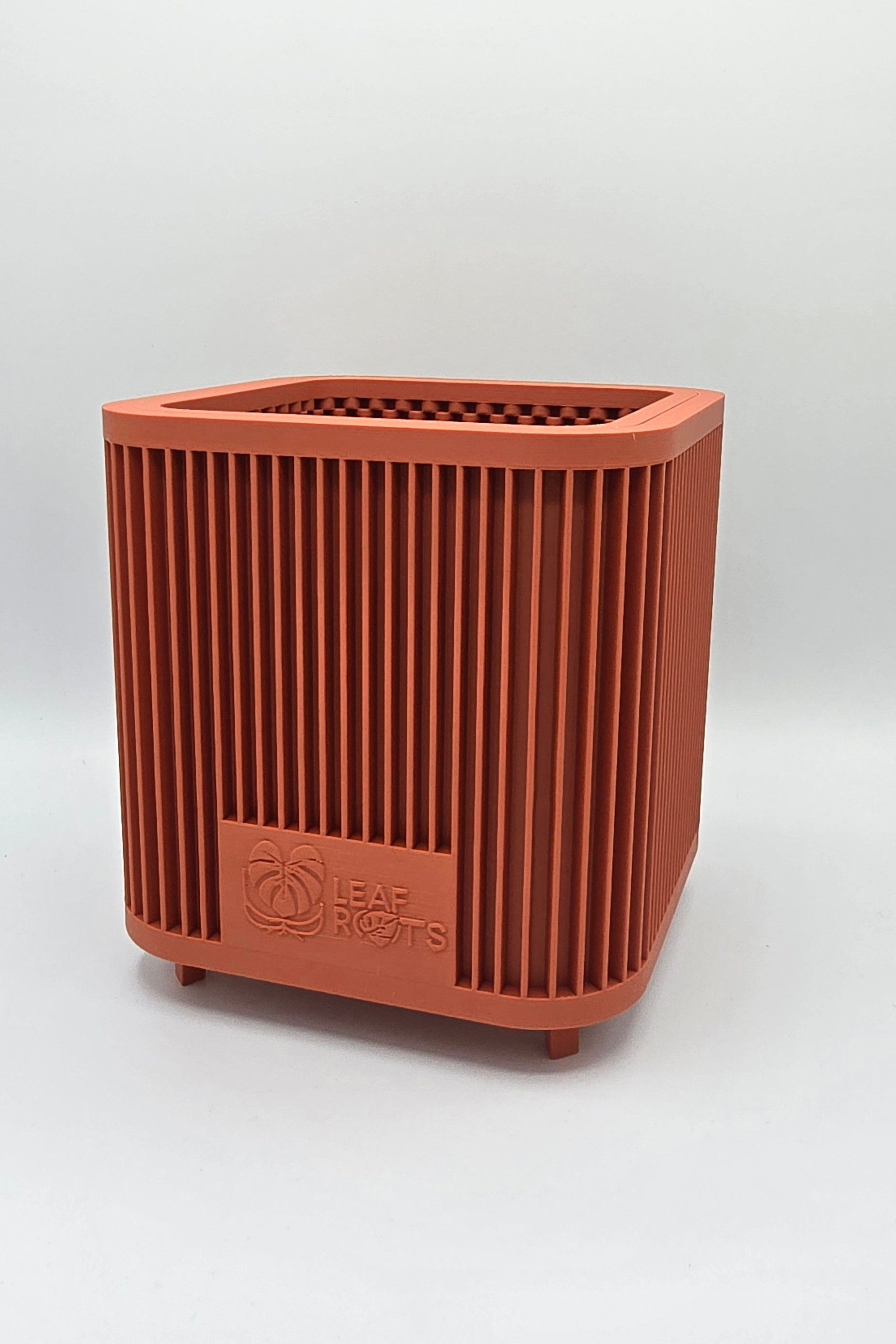 Der AirRoot Selbstbewässerungstopf von Leaf and Roots verbindet modernes Design mit funktionaler Technik. Jeder Topf entsteht im präzisen dreidimensionalen Druck und besitzt ein belüftetes Innenleben mit hunderten feinen Mikroöffnungen. Diese Struktur hält das Substrat locker und versorgt die Wurzeln kontinuierlich mit Sauerstoff.